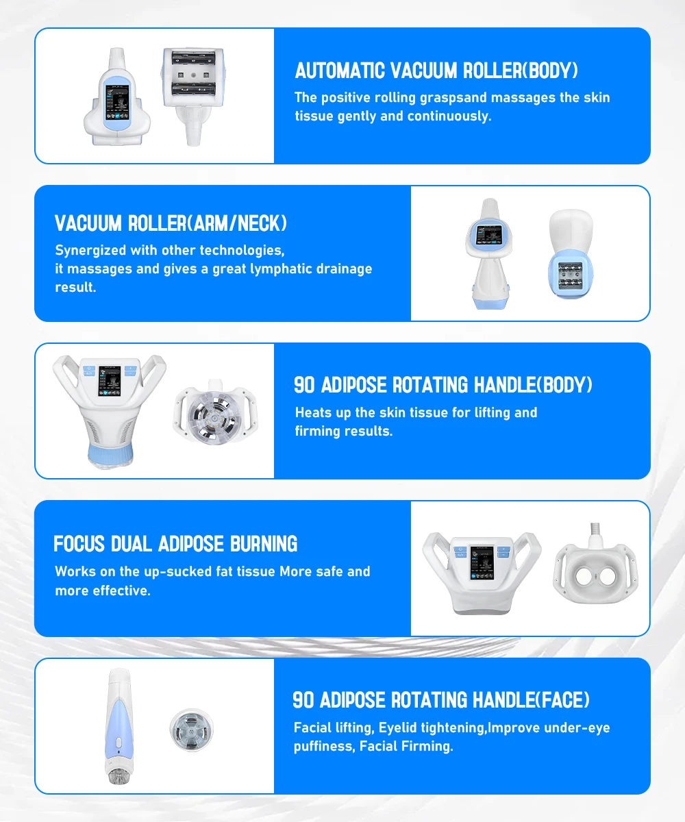 - Remodelarea corporală: Prin utilizarea tehnologiei de vacuum și RF, aparatul poate ajuta la îmbunătățirea conturului corporal prin reducerea grăsimii localizate și prin stimularea tonusului muscular.