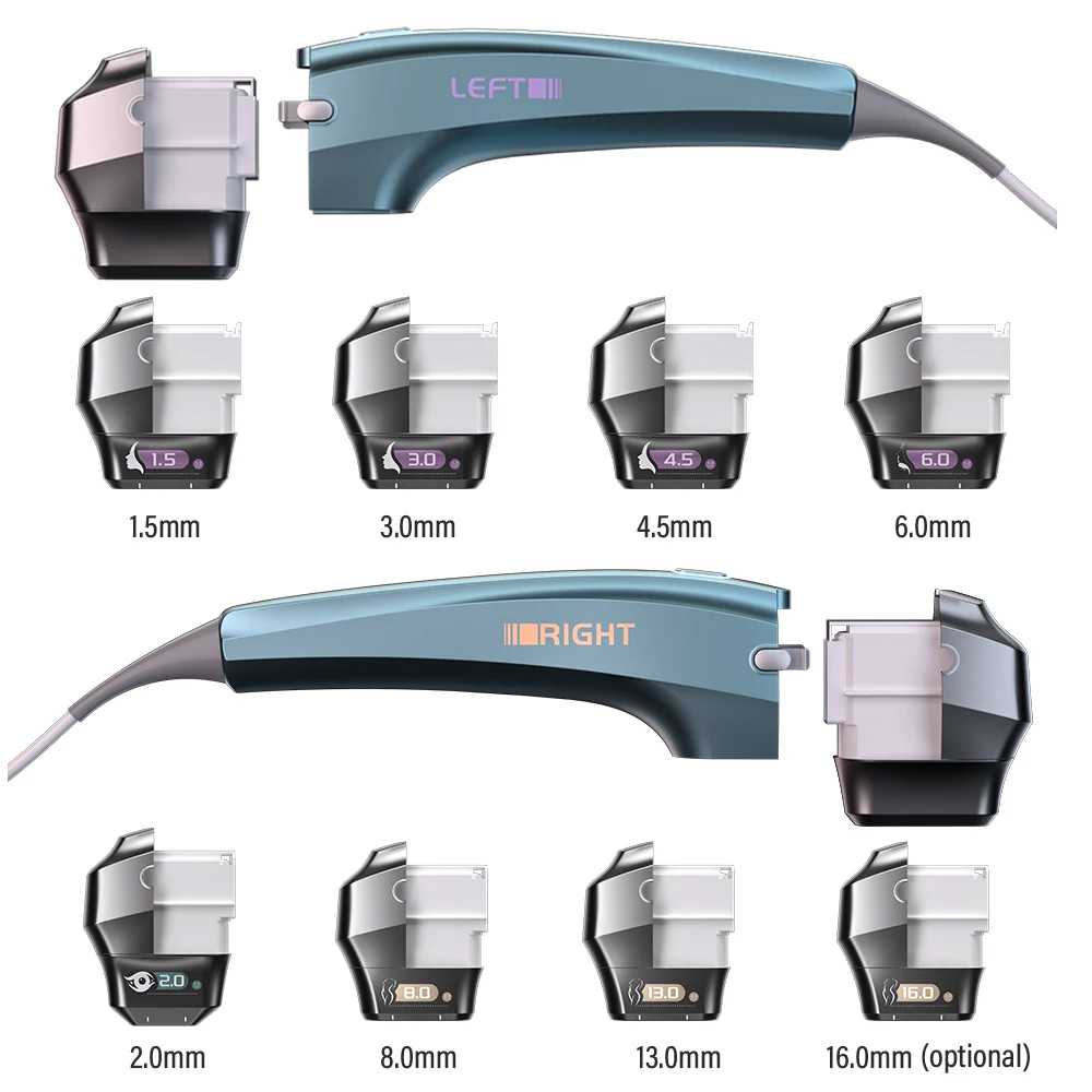 3. Versatilitate și personalizare: Echipamentul include cartușe specializate pentru diverse adâncimi ale pielii, permițând un tratament personalizat în funcție de zona vizată. De exemplu, cartușul DS-1.5 mm este folosit pentru zona frunții, iar cartușele DS-3.0 mm și DS-4.5 mm pentru strângerea pielii de pe bărbie, obraji și gât.