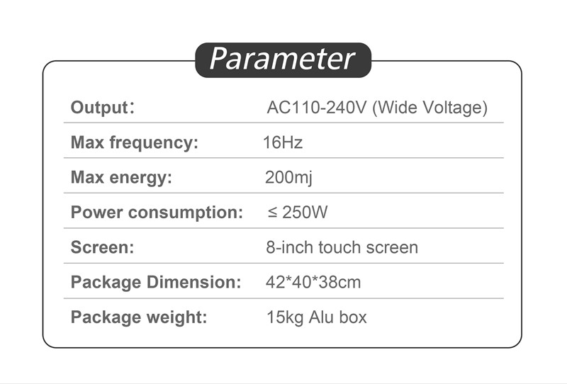 – Aplicație largă: Cu 5 dimensiuni de vârfuri pentru ameliorarea tuturor durerilor articulare, frecvența 216 Hz, capabilă să ajungă la 8 cm subcutanat, nu numai pentru ameliorarea durerii, stimulează formarea colagenului, dar și pentru ED și multe scopuri cosmetice, cum ar fi remodelarea corporală, anticelulitică tratament și nu numai.