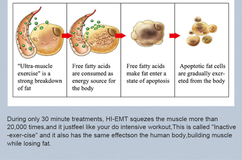 Tehnologie electromagnetică pulsată de înaltă intensitate este ca și cum ai face 20.000 de abdomene sau genuflexiuni în doar 30 de minute fără muncă grea și transpirație. Tratamente de 30 de minute, tratamentele sunt rapide și pot fi efectuate în timpul unei pauze de masă. Dovedit clinic complet testat în 7 studii independente pentru siguranță și eficacitate.