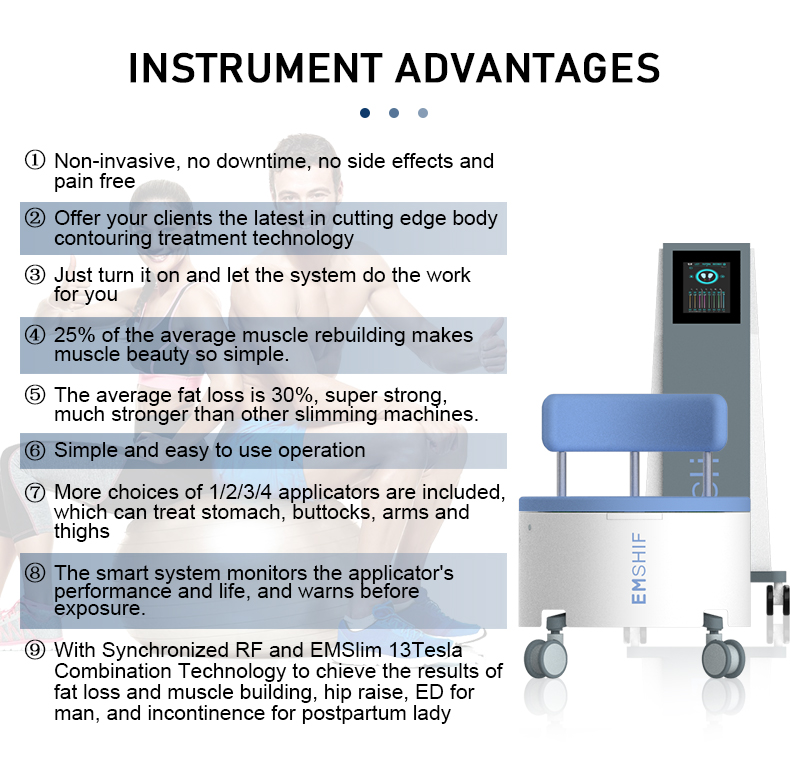 Cu RF sincronizat și tehnologia combinată EMSlim pentru a obține rezultatele pierderii de grăsime și creșterea mușchilor, ridicarea șoldului, ED pentru bărbați și incontinență pentru femeile postpartum.