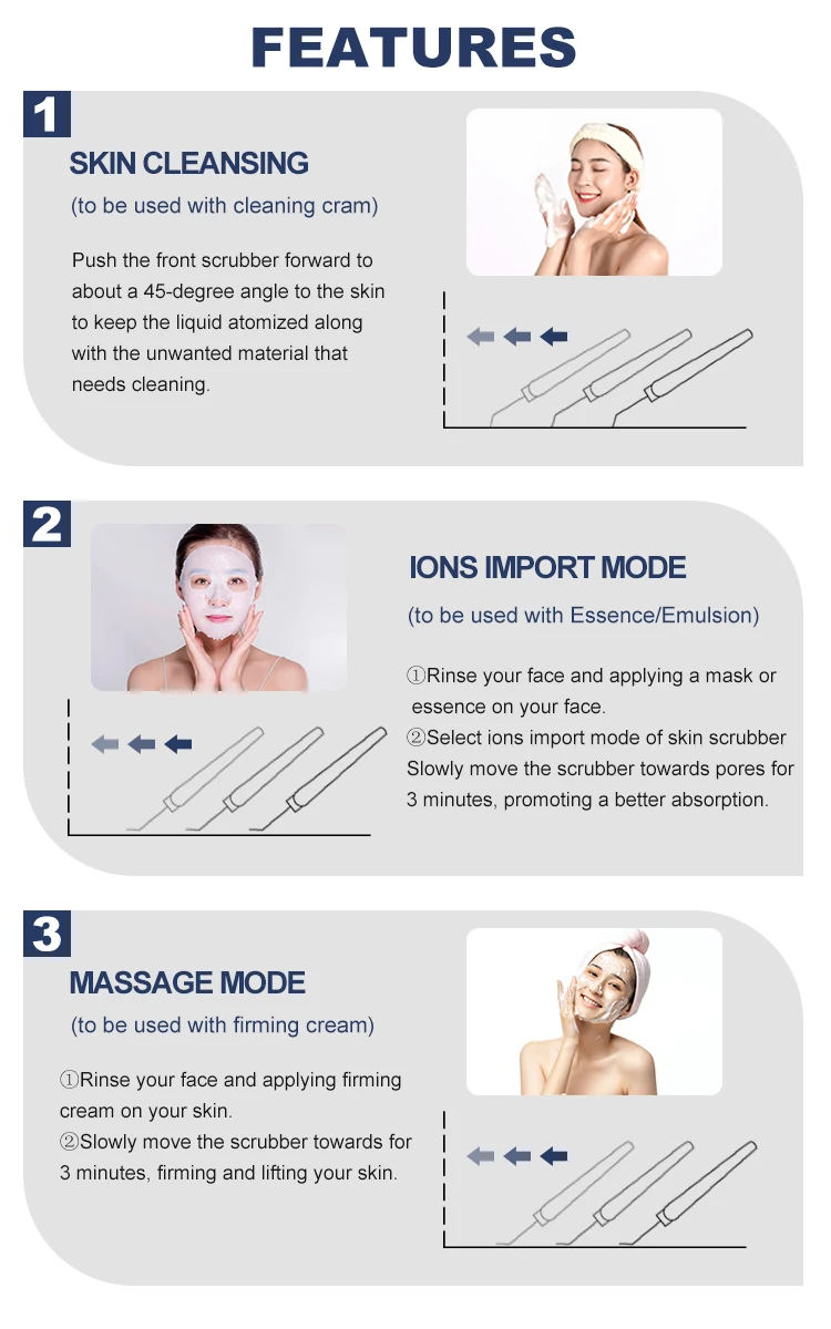 1. Funcționare cu ultrasunete: Acest dispozitiv folosește unde ultrasonice de înaltă frecvență pentru a curăța pielea. Aceste unde vibrează la o frecvență mare, creând micro-masaj care ajută la exfolierea stratului superior al pielii și îndepărtarea celulelor moarte.